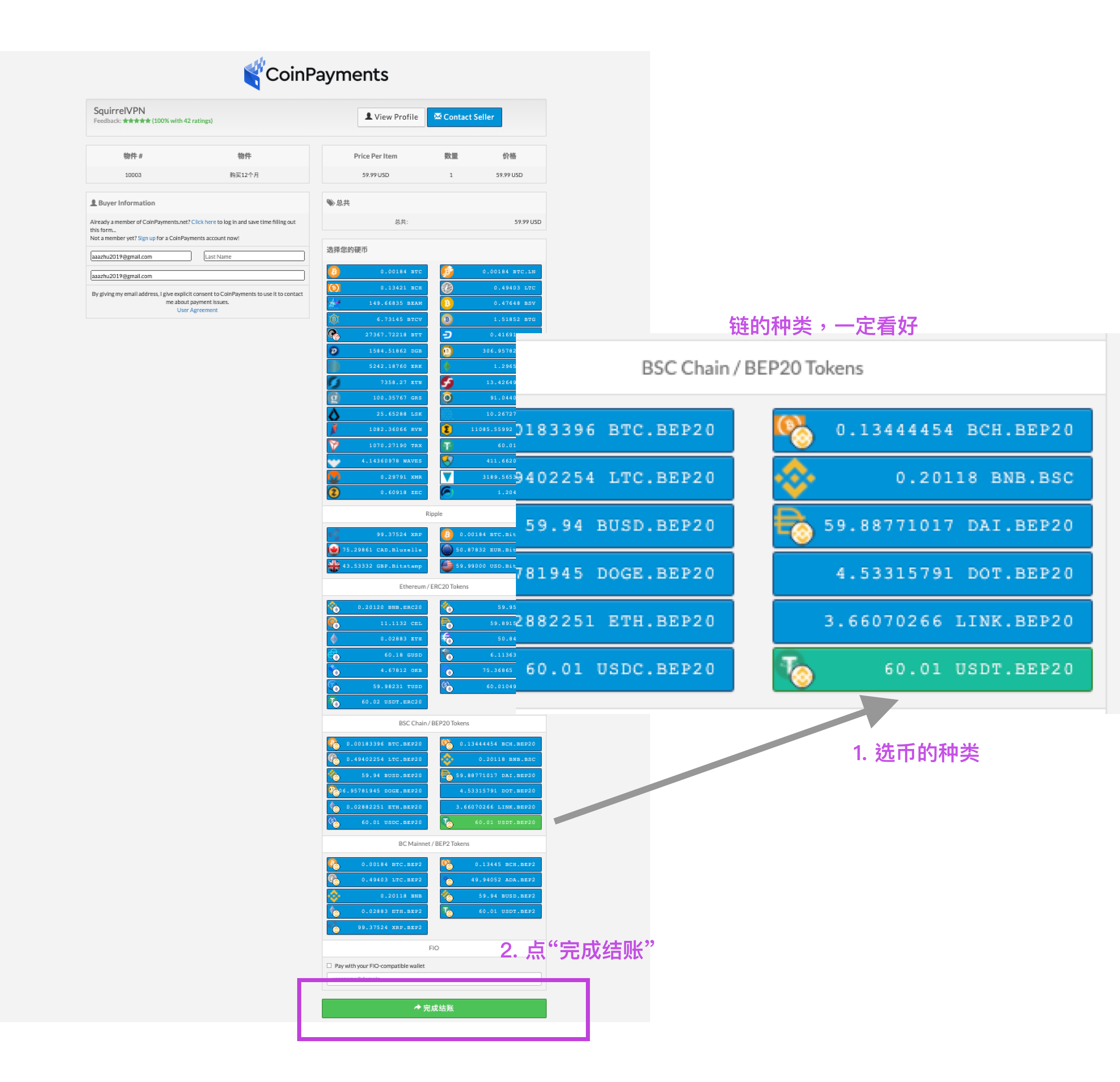 松鼠支持70+加密货币,主流的加密货币基本都支持。请选择您需要使用哪种进行支付。